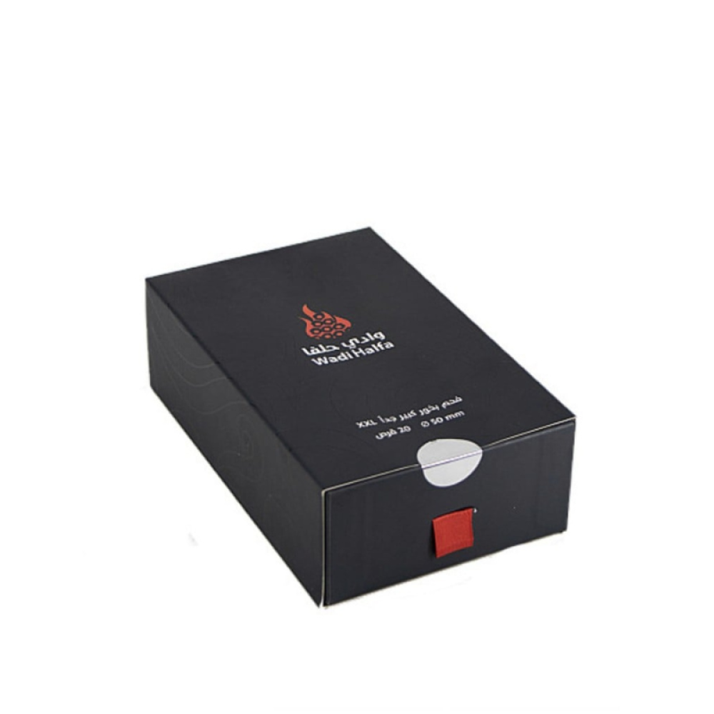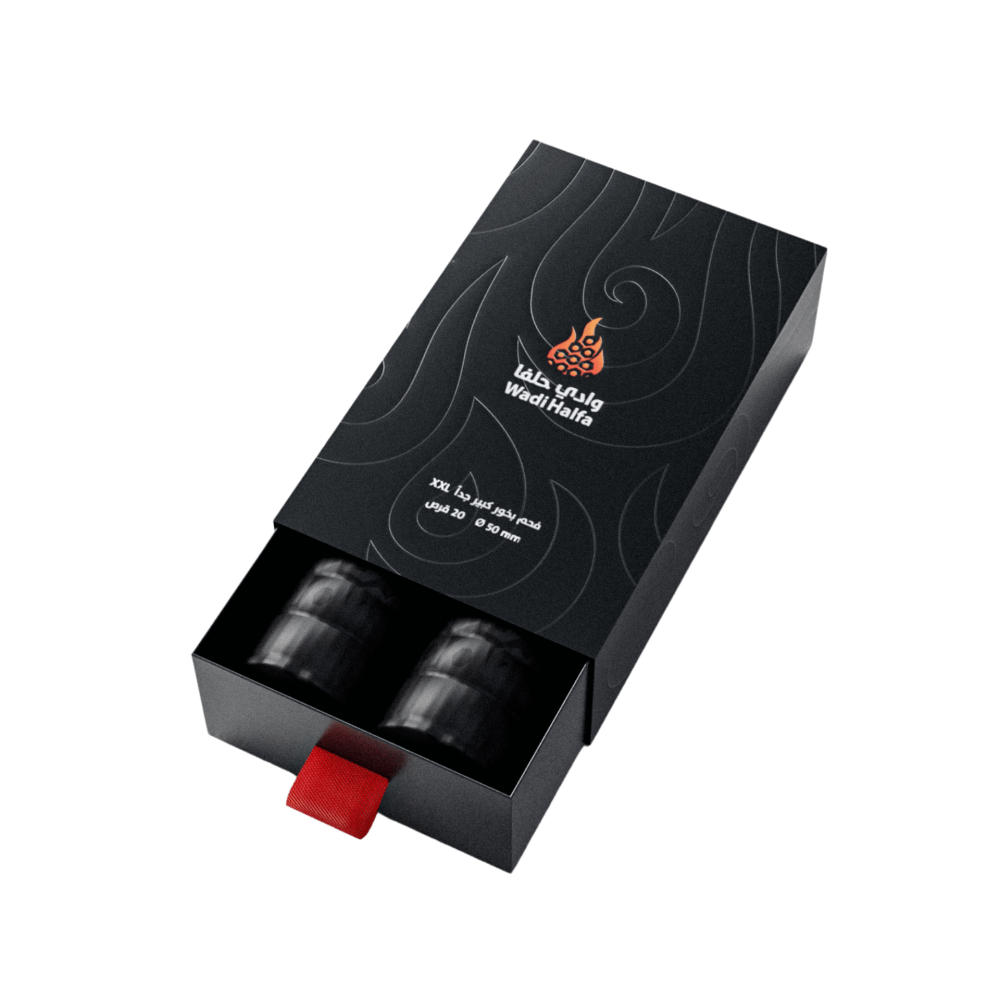 فحم وادي حلفا حجم كبير 50 مم- تحتوي العلبة على 2 مغلّف.- يحتوي كل مغلّف على 10 أقراص دائرية.- العدد الكلي: 20 قرص.- حجم القرص: 50 مم
