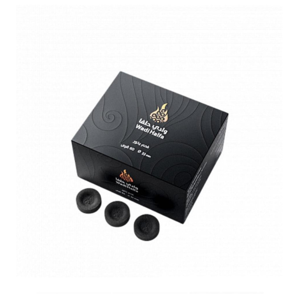 فحم وادي حلفا حجم وسط 33ممتحتوي كل علبة 6 مغلّفاتيحتوي كل مغلّف على 10 أقراص دائريةالعدد الكلي: 60 قرصحجم القرص: 33 مم